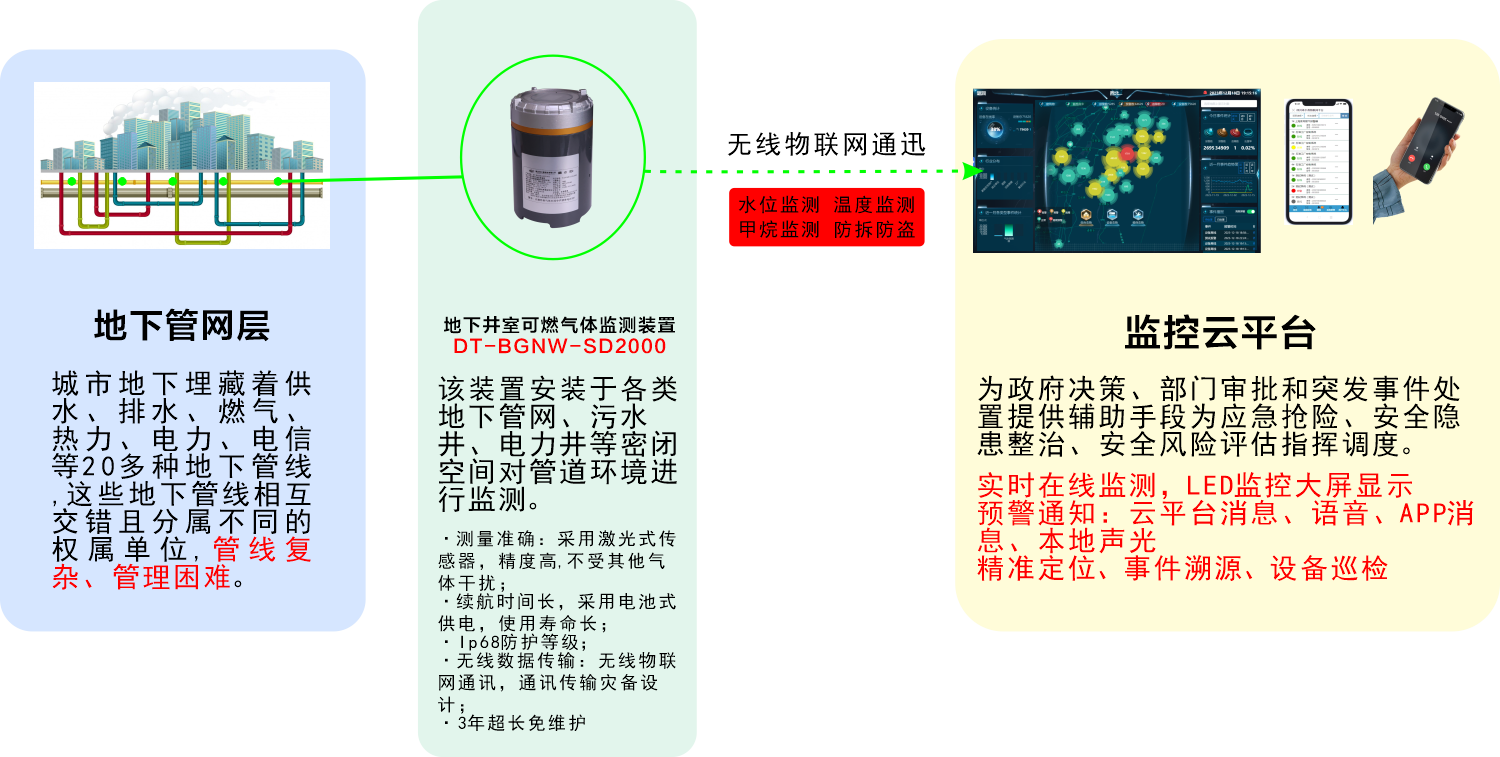 ·許多城市地下油氣管道與市政管網互相交錯,供熱、供水、排水、污水管道也會產生大量的可燃氣/毒氣,逐漸聚集在地下管網中,環境復雜,隱蔽性強且變更頻繁,傳統排查監管手段不難以及時發現安全隱患;